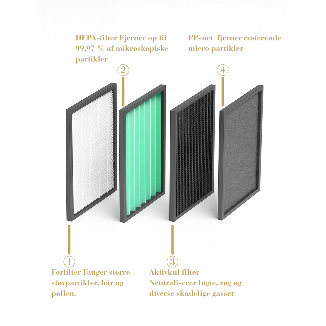 • ② HEPA-filter Fjerner op til 99,97 % af mikroskopiske partikler som allergener, bakterier og skadelige partikler ned til 0,3 mikrometer – for renere og sundere luft.