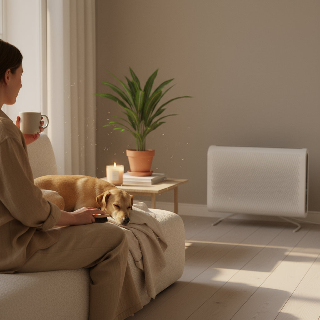 Hunden giver ro i kroppen men luften føles tung. Små hår og mikropartikler svæver i solstriberne og sætter sig i tekstilerne. AuraHome renser stille i baggrunden. HEPA 13 fanger pels og mikropartikler mens kulfilteret binder lugten. Rummet føles let og rent og du kan sænke skuldrene igen.