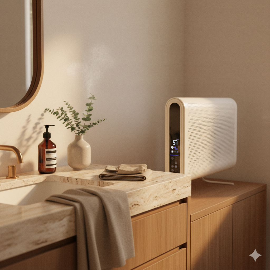 Varme bade, parfumer og rengøring kan gøre luften tæt. AuraHome står diskret på badeværelset og fjerner lugtmolekyler og fine partikler fra spray og damp. Du går ud til resten af dagen uden tung duft hængende i rummet.